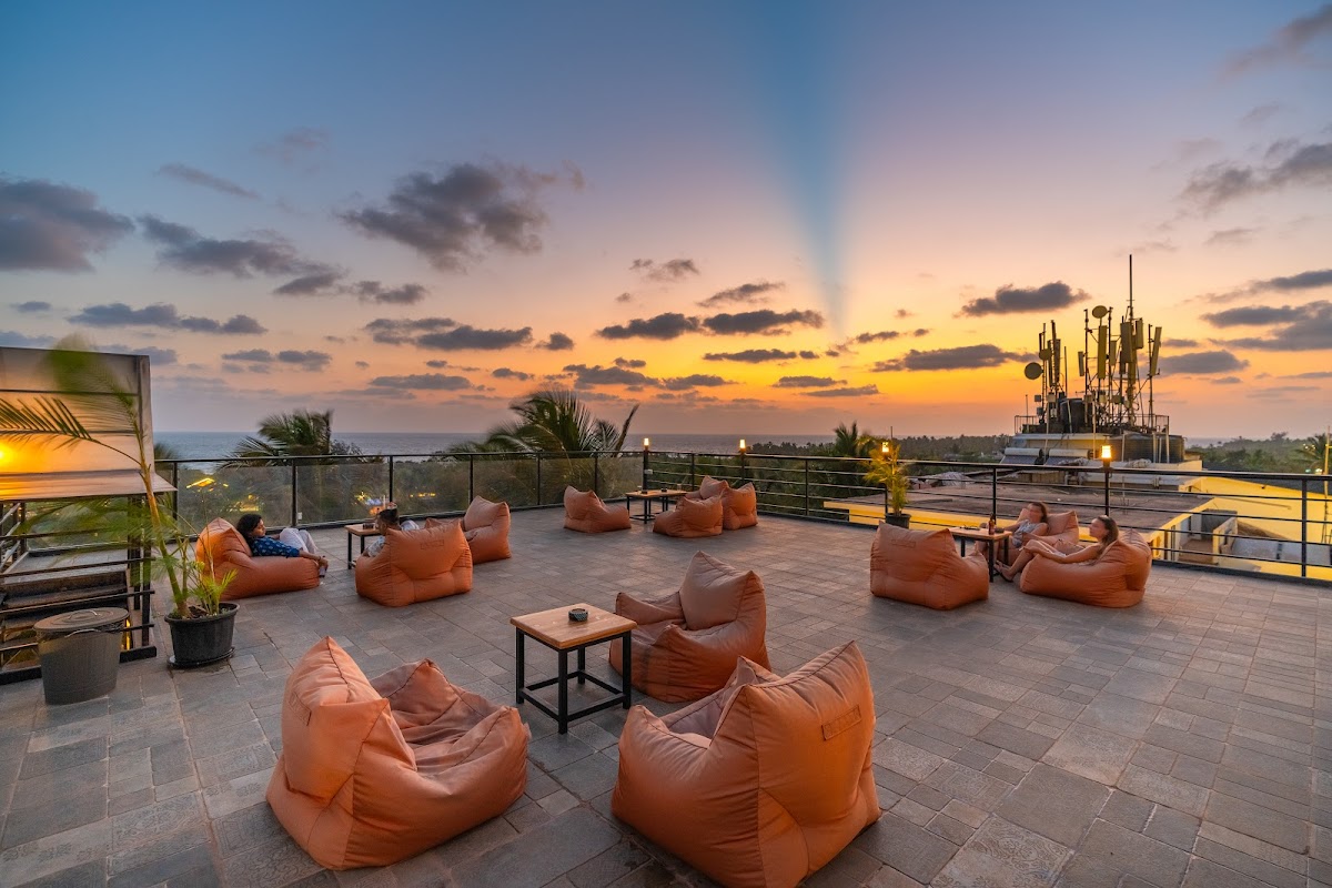 As you ascend to the rooftop, be prepared to be enveloped by a relaxed, inviting atmosphere where the sound of the waves is harmonized with light, upbeat music. The ambiance is perfect for both intimate gatherings and lively nights amongst friends. Picture sipping on a well-crafted cocktail as the sun paints the sky in vibrant shades, a scene described by our patrons as “one of the most happening spots near the beach.”